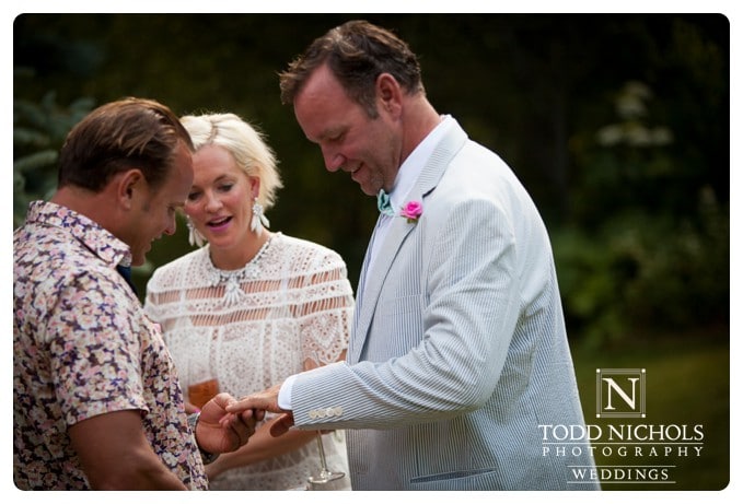 The playful sunbeams swirled each other about on the wide, bubbly surface of the Russian River, as if they too were wild with the anticipation and excitement of the events to take place that day. The sedate little log cottage with Bavarian decor and the petite covered bridge chose a calmer approach. When, towards the late afternoon, a party of people arrived, they were greeted by the verdant forest, the gentle, rippling surface of the river, and the small talk of the squirrels. At last the event for which Croney Cove was prepared was ready to begin. And so, standing before a minister, Jenny and Gus faced each other, preparing to speak their wedding vows. With their closest family and friends rallied around them, and atmosphere of wonder enveloped the couple as the ceremony passed before them like a dream. The light on the river seemed to be waltzing more peacefully as the ceremony drew to a close. The bride and groom, accompanied by their small entourage, proceeded to the bridge where a long table had been set and bedecked with bouquets of the little flowering delights of summer.