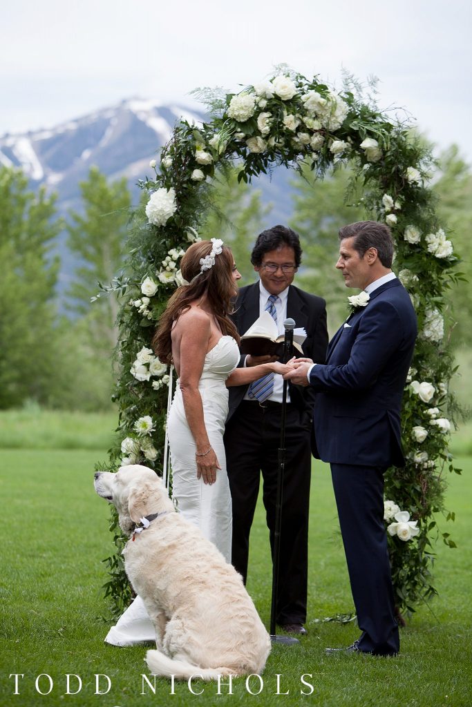 This intimate destination wedding was planned down to the smallest detail including transporting the gorgeous china and crystal seen below from California to Sun Valley Idaho for this day. We adore all the wedding details and love that Roblee and Scott’s dog was also part of the wedding ceremony! He was adorable!